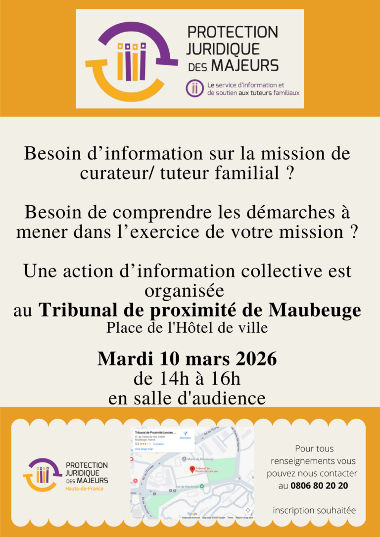Le Service d’Information et de Soutien aux Tuteurs Familiaux vous propose un temps d’information collective organisé au tribunal judiciaire de Maubeuge.