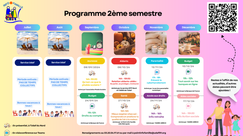 Le Point Info Famille organise tous les mois des temps collectifs nommés « les rendez-vous du PIF » portant sur différentes thématiques familiales (logement, emploi, petite enfance, séniors, budget, parentalité…). Ils se déroulent en présentiel dans les locaux de l’Udaf du Nord ou en visioconférence.